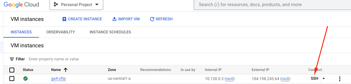 On the VM page, locate the machine that you created and click on "SSH" to access the terminal.